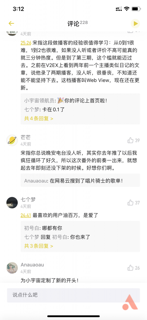 当然了,如果你和我一样,是播客领域的「老鸟」,早已养成了属于自己的收听习惯,但又希望发现点新内容,这个时候,你会发现小宇宙简直就是「神器」。Shownotes 中还能继续搜索,复制文本后,长按选中文字可以调用强大的搜索引擎 magi 和互动百科进一步搜索了解,无论是搜节目还是搜内容,都可以轻松实现。作为一款「泛用型」播客客户端,《小宇宙》支持 RSS 直接订阅。前些时候,即刻推送了一篇回顾 RSS 的文章,里面提到「播客至今还在依赖着 RSS 协议发展,并且 RSS 是它最重要的生态之一」,事实上原本《即刻》的精神内核也是 RSS。《即刻》虽然因「技术升级」至今无法使用,但仍旧有一大批忠实用户,在 5 周年之际,十分贴合《即刻》老用户的审美取向的播客应用《小宇宙》登场。所以你能看到《小宇宙》本身对 RSS 的支持有多棒。《小宇宙》中可以直接输入 Feed 地址进行订阅,只要节目的 RSS 源在,原则上就可以播放,将节目添加到播放列表中,就会自动缓存到本地,随时可听。另外《小宇宙》还可以导入其它平台的节目,而且有详细的使用教程教你如何导入其它客户端的订阅数据。当然,《小宇宙》并不是十全十美,但打开它你会获取到每日推荐的新播客、优秀的中文播客和一些有趣的独立播客。无论是刚刚接触播客的小白用户,还是老听众,都能在《小宇宙》中轻松发现自己感兴趣的内容。「发现」页每天会推荐一些内容,如果你感兴趣的话可以点击来听,对于刚接触播客不知道听什么的小白用户来说可以通过这个渠道来知道了解更多播客、更多内容;「我的播客」中是已经订阅的播客,如果你从别的平台导入内容,那么也会出现在这里;「个人」页面可以换头像、添加个性签名和一些系统设置。「发现」页中推荐的内容下方会显示有谁听过,如果这些用户中有你的好友,那么可以选择关注他/她,当然还可以发现更多和你有相同品味的听友,通过查看他们订阅的节目清单来发现更多好节目。具有特色的点赞按钮,播放进度条上高低不一的柱状条——这意味着你可以对不同节点的内容点赞,而且不限次数。被点赞得越多,柱状条就越高,即这一段内容热度很高,打开一个节目就可以看到哪一段更受欢迎,就能直观了解一个节目中的精华和亮点。我很喜欢看听友们的评论,分享评论时可以打上时间戳,这个时间是可以点击的,点击之后就能跳转到对应评论的时间节点,这类型的评论有点类似视频网站里的实时弹幕,听友之间互动性很强。《小宇宙》目前还在公测阶段,一些功能还不够成熟完善,比如不支持夜间模式,要知道在临睡前听播客是听众的习惯;一些功能性如音量增强、无人声部分去除、下载播客等都还未能实现,这些功能相信后续产品更新迭代会完善。另外也有用户对「社交」天生有排斥感,一款 app 如何平衡社交的「度」尤为重要。《小宇宙》作为播客 app 在我看来社交的程度刚刚好,评论中不但可以发现同口味的新朋友,更会和老朋友有新的共鸣与话题;而且很多评论都很有趣,可以看出评论的人也拥有有趣的灵魂。相比于传统的播客客户端,我们发现播客的途径无非推荐就是搜索,小宇宙的「轻社交」让我们可以轻松了解到大家都在听什么,这种感觉对我而言更像是一种寻宝,非常奇妙。下载《小宇宙》 app 后需要邀请码才能注册进入,已注册的老用户会拥有邀请码可以用来邀请其它用户注册。小宇宙支持 iOS & Android,免费下载。