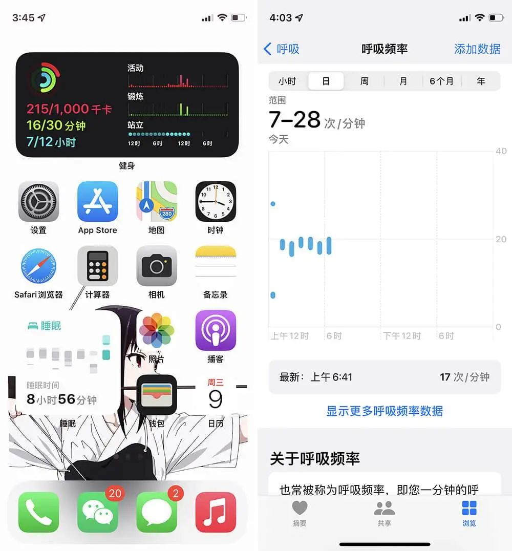 当你睡觉时,Apple Watch 会记录你每一分钟的呼吸频率(即睡眠呼吸率),让你对自己的身体状态更加了解。同时还加入了睡眠记录的小组件,在主屏幕就能看到近期的睡眠情况。