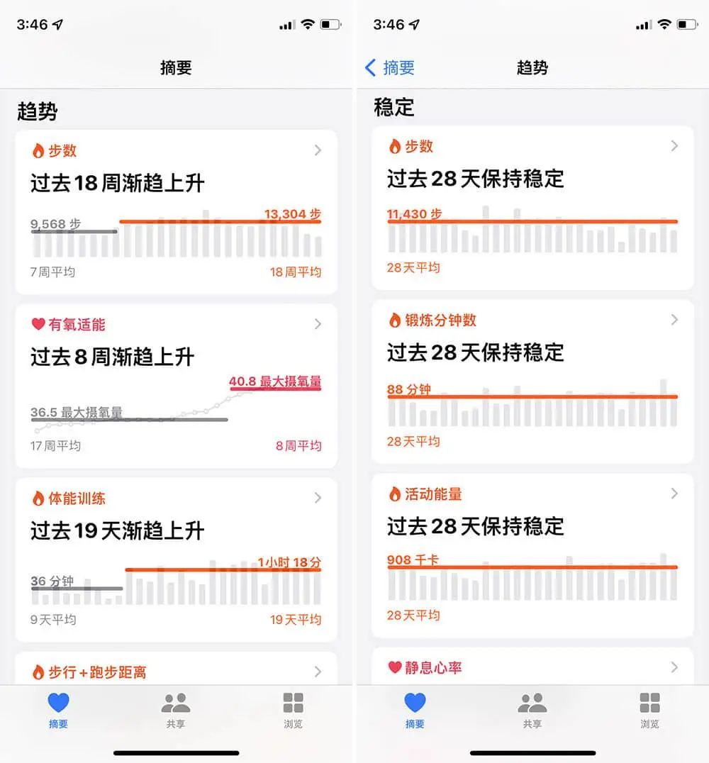 《健康》app 首页的趋势有了更加直观的展示形式,近期的运动状态是涨是跌一目了然。进入「健康趋势」界面,你还可以看到其他趋于稳定的健康数据。清晰的数据展示,似乎能让我们看到健康。